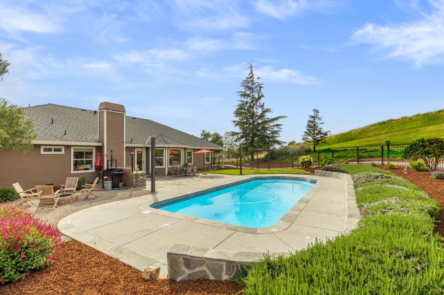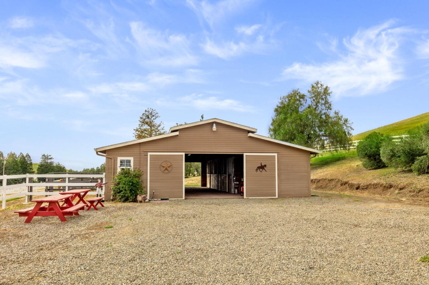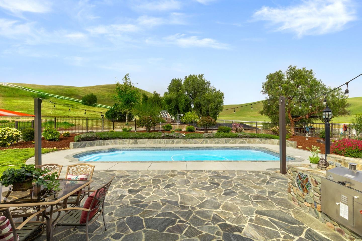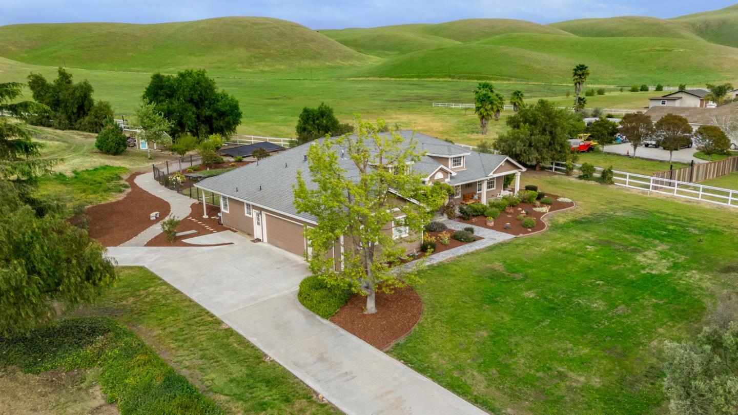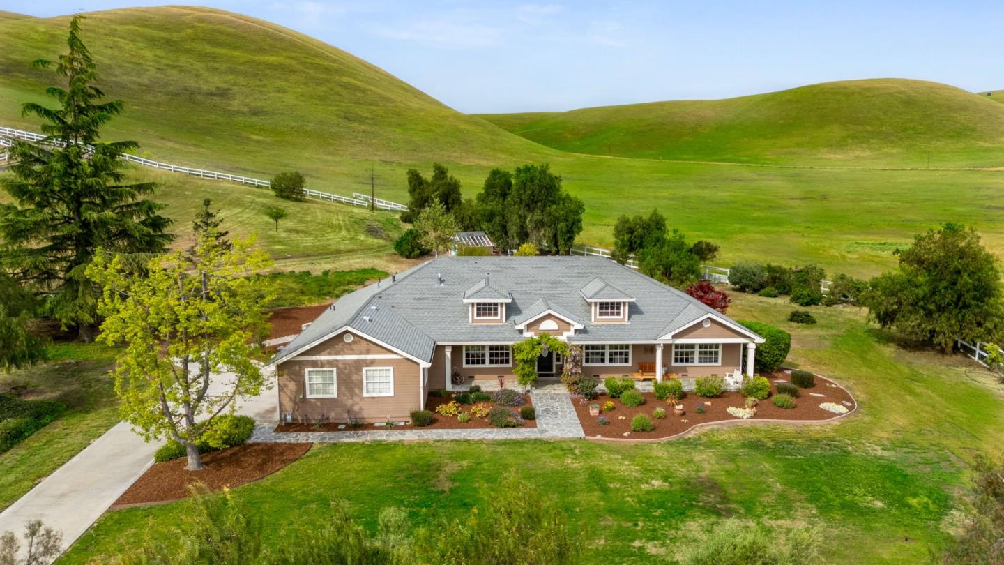 Nestled in the gated equestrian community of Stonegate, this elegant residence offers expansive living with vaulted ceilings, natural light, and refined updates throughout. The open-concept design includes formal living and dining areas, a gourmet kitchen with granite countertops and stainless appliances, and a wood-burning fireplace with gas hookup. New hardwood floors enhance key living spaces, while panoramic views of rolling hills and pastures create a serene backdrop. Outdoors, the property unfolds into a private retreat with a solar-heated pool, spacious patio, and refreshed landscaping. Equestrian amenities include a six-stall barn, three irrigated and fenced pastures, and direct access to bridle paths. This home offers RV/boat parking, a greenhouse, storage, and is located adjacent to protected ranchland, ensuring unobstructed views. Just minutes from downtown Hollister, top schools, local wineries, golf courses, and Pinnacles National Park, this home offers a rare blend of luxury, space, and lifestyle in one of San Benito County's most sought-after settings.