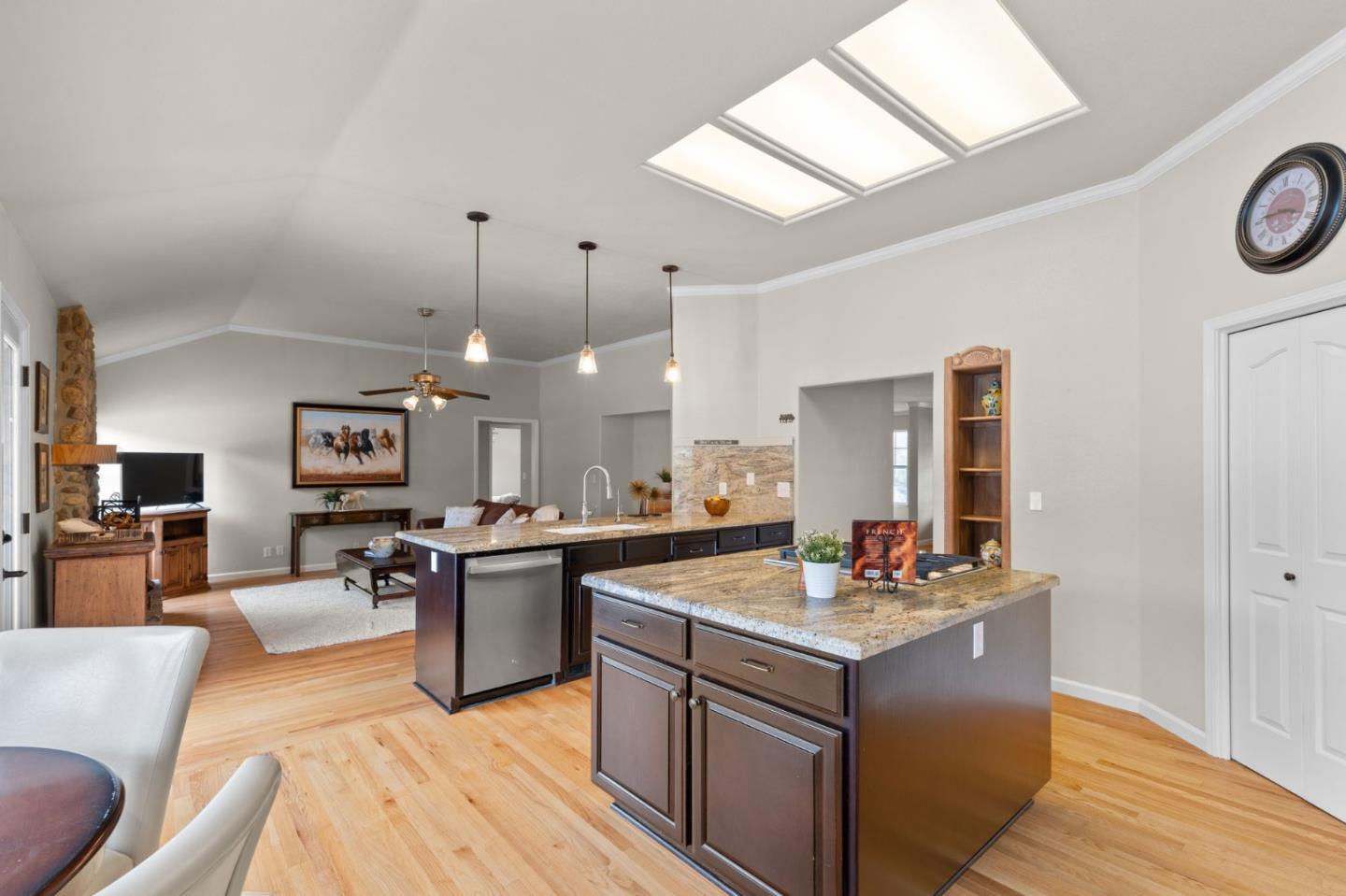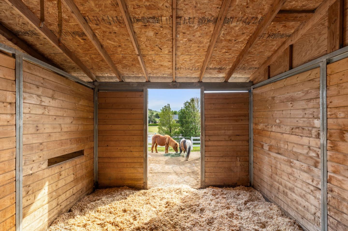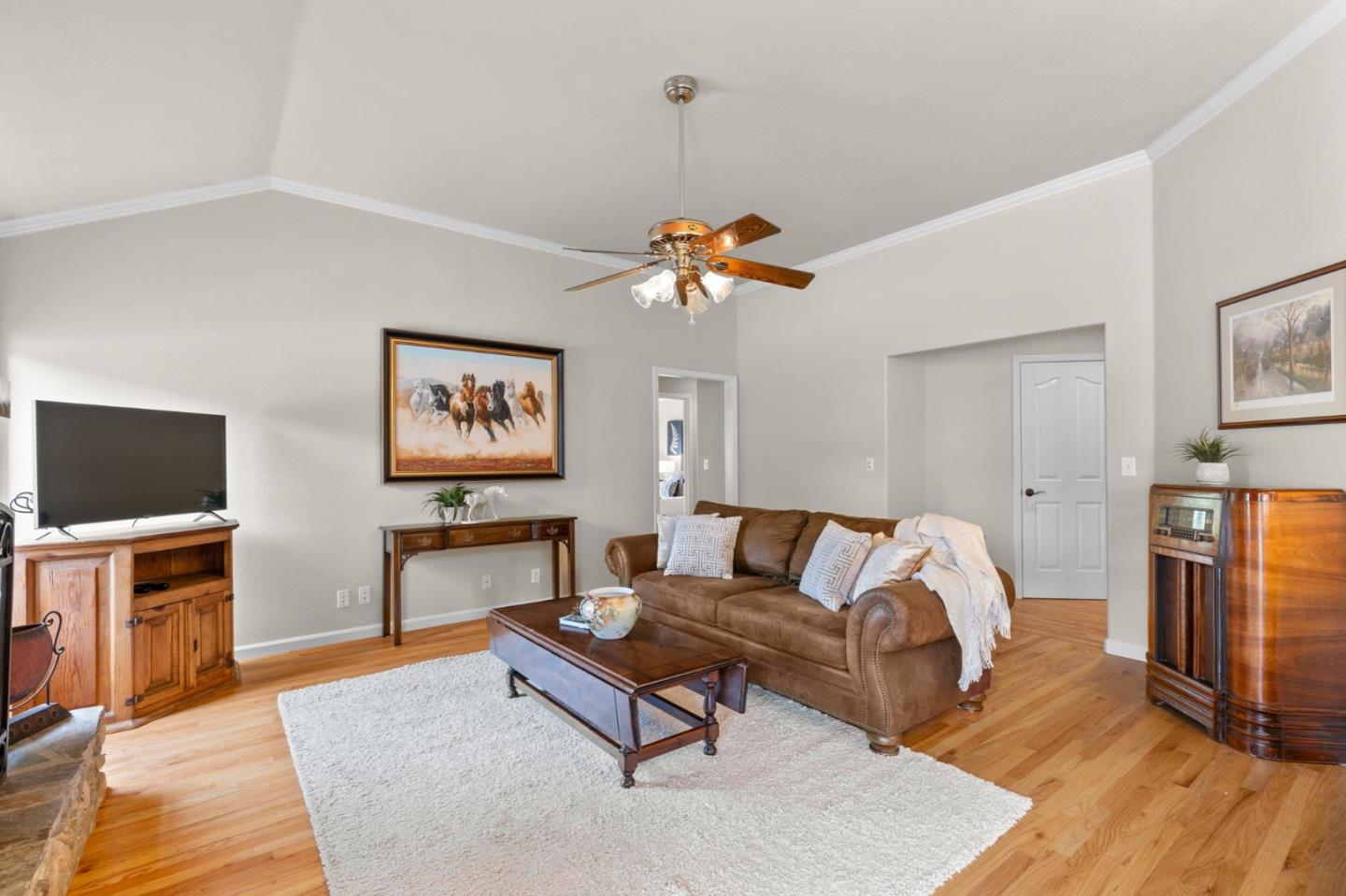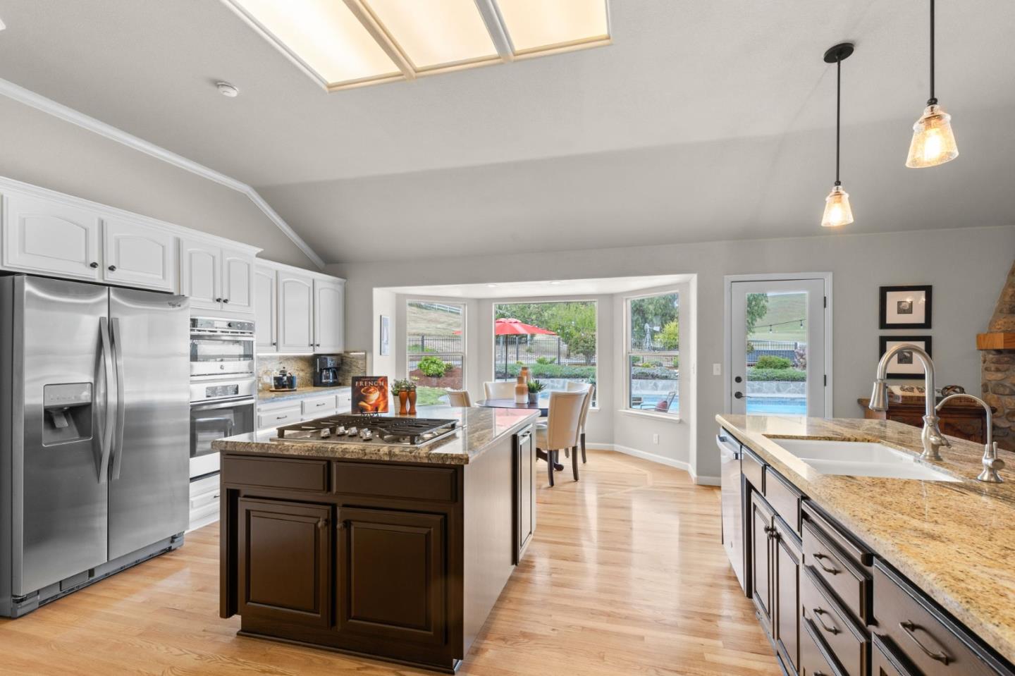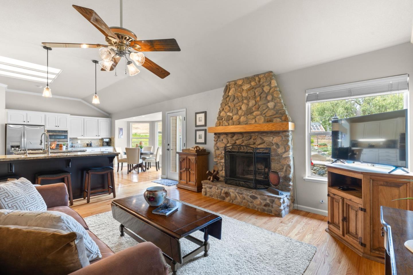 Nestled in the gated equestrian community of Stonegate, this elegant residence offers expansive living with vaulted ceilings, natural light, and refined updates throughout. The open-concept design includes formal living and dining areas, a gourmet kitchen with granite countertops and stainless appliances, and a wood-burning fireplace with gas hookup. New hardwood floors enhance key living spaces, while panoramic views of rolling hills and pastures create a serene backdrop. Outdoors, the property unfolds into a private retreat with a solar-heated pool, spacious patio, and refreshed landscaping. Equestrian amenities include a six-stall barn, three irrigated and fenced pastures, and direct access to bridle paths. This home offers RV/boat parking, a greenhouse, storage, and is located adjacent to protected ranchland, ensuring unobstructed views. Just minutes from downtown Hollister, top schools, local wineries, golf courses, and Pinnacles National Park, this home offers a rare blend of luxury, space, and lifestyle in one of San Benito County's most sought-after settings.