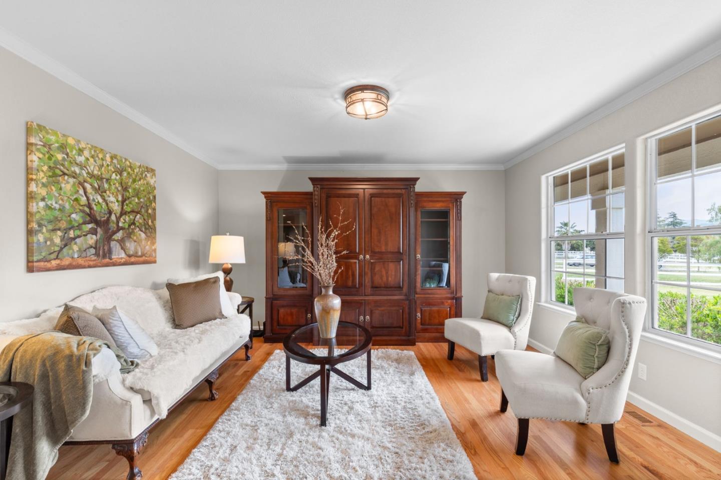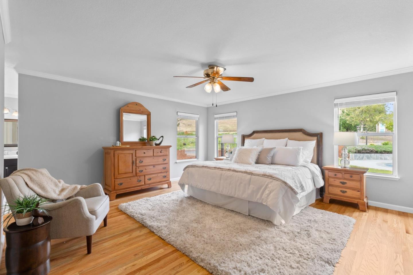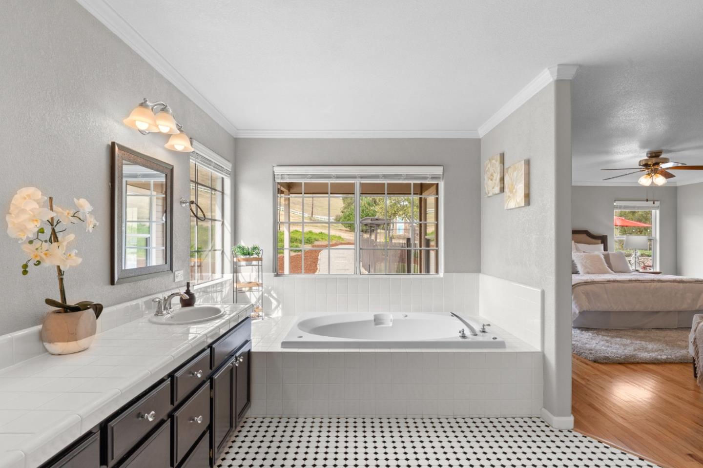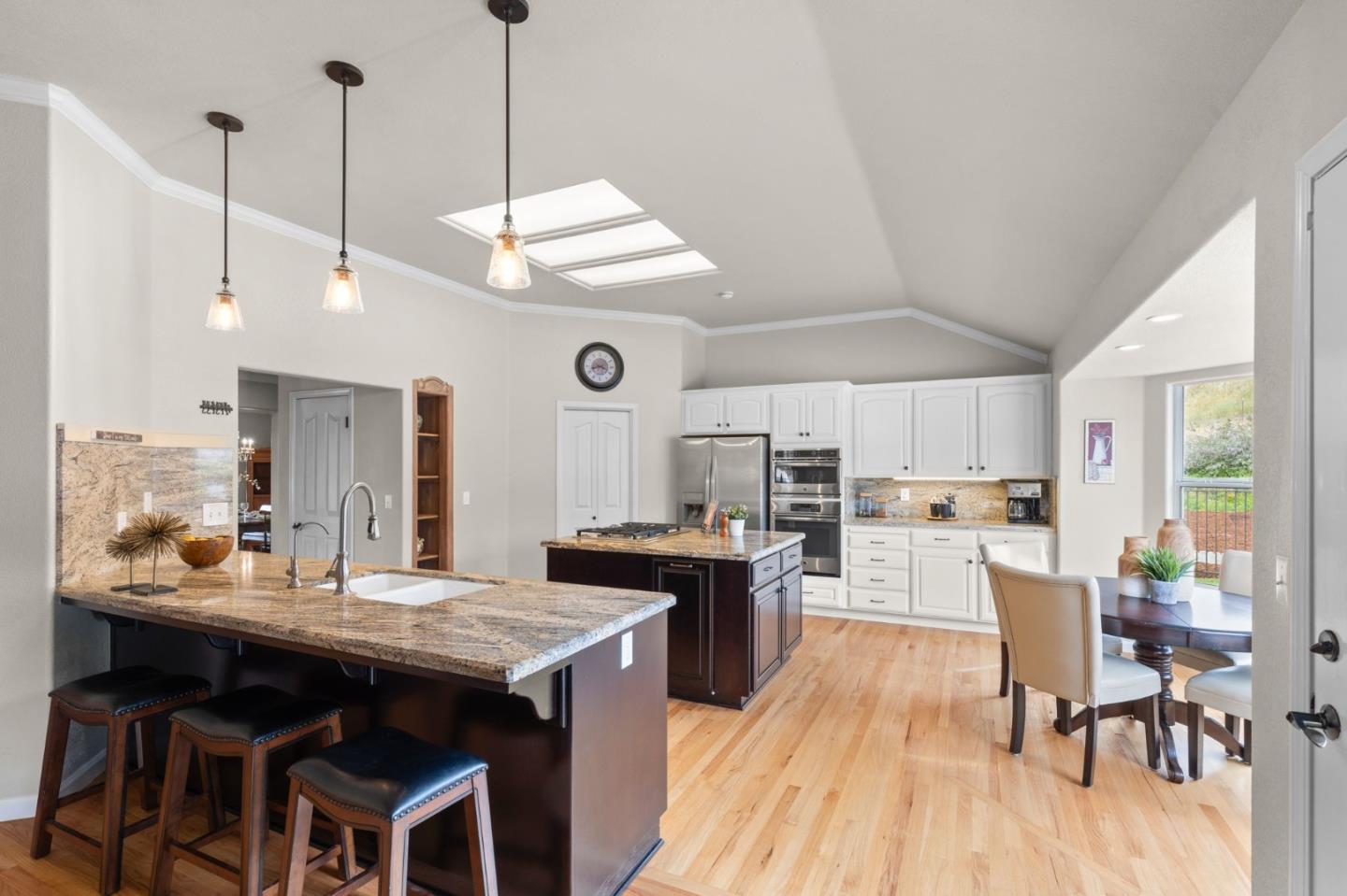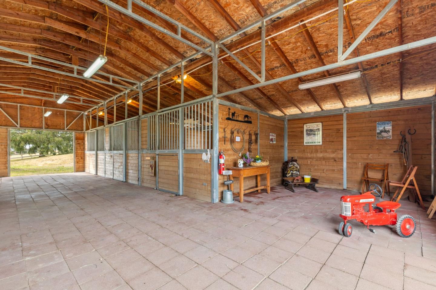 Nestled in the gated equestrian community of Stonegate, this elegant residence offers expansive living with vaulted ceilings, natural light, and refined updates throughout. The open-concept design includes formal living and dining areas, a gourmet kitchen with granite countertops and stainless appliances, and a wood-burning fireplace with gas hookup. New hardwood floors enhance key living spaces, while panoramic views of rolling hills and pastures create a serene backdrop. Outdoors, the property unfolds into a private retreat with a solar-heated pool, spacious patio, and refreshed landscaping. Equestrian amenities include a six-stall barn, three irrigated and fenced pastures, and direct access to bridle paths. This home offers RV/boat parking, a greenhouse, storage, and is located adjacent to protected ranchland, ensuring unobstructed views. Just minutes from downtown Hollister, top schools, local wineries, golf courses, and Pinnacles National Park, this home offers a rare blend of luxury, space, and lifestyle in one of San Benito County's most sought-after settings.